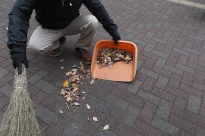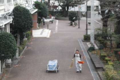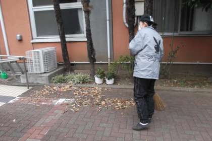 中庭に落ち葉が・・・ 主事さんが落ち葉掃きを行っています