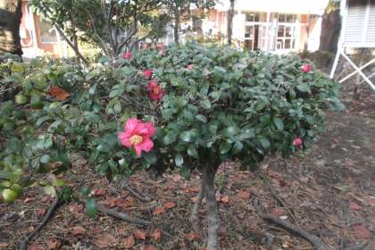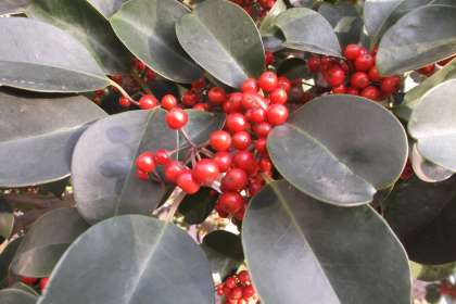 中庭のヤブコウジ(十両)に赤い実がついています。