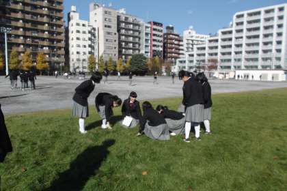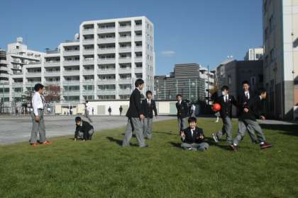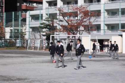 快晴の昼休み、校庭ではサッカー、バレーボール