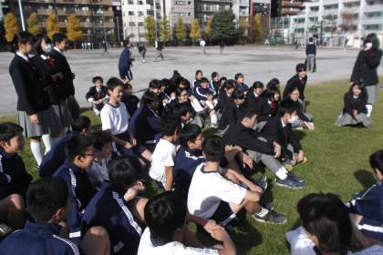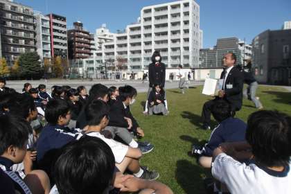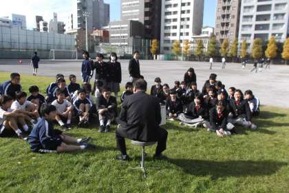 昼休みに芝生の上で、校長が絵本の読み聞かせを