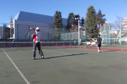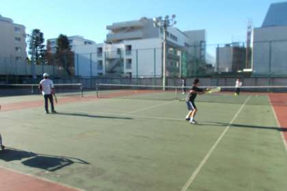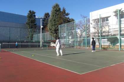 硬式テニス部は青空の下、元気に練習をしています。 すがすがしい空気が流れています。