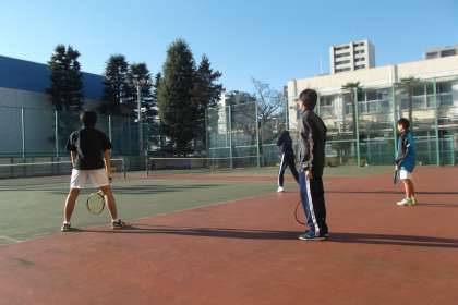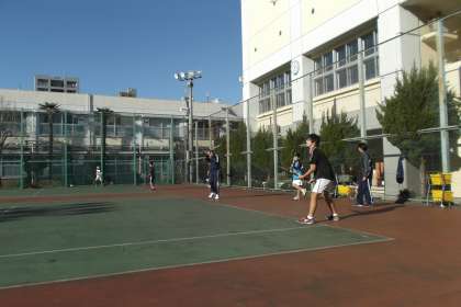テニス部は、青空の下練習に励んでいます。 とても、清々しい練習風景です。