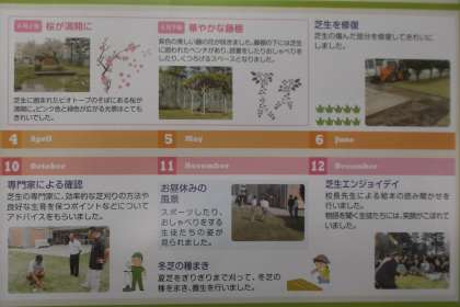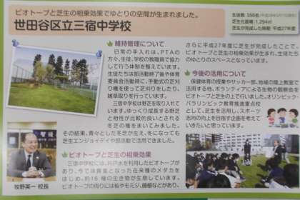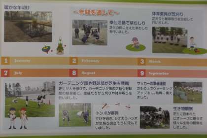 ご覧ください。本校のビオトープと芝生の取り組みが