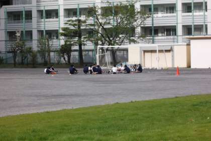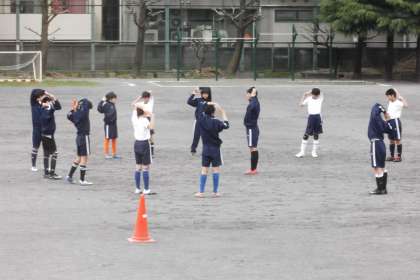 サッカー部は外部指導員の 指導の下、準備体操をしていました。