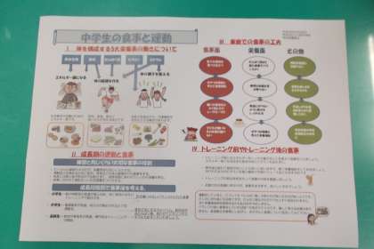 部活動保護者会 公開日 2017/04/28 更新日 2017/04/28 学校日記 紹介後、栄養士より「中学生の食事と運動」と いうことで、プリントを使って説明がありました。 体育館のパイプ椅子はバレー部、バスケット部の 生徒が片づけてくれました。 いいね(0)