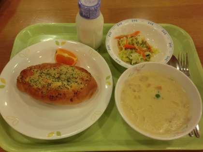フランスパンの上にバター、粉チーズ、ニンニク。パセリを