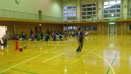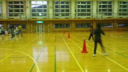 体育館を使ってのレク大会が開始されました。くじを引いて、様々な動きで往復します。
