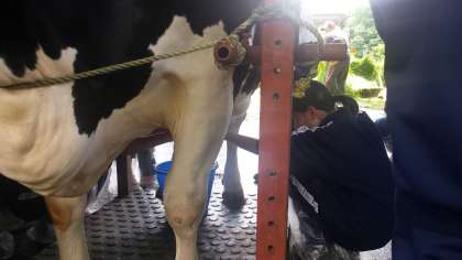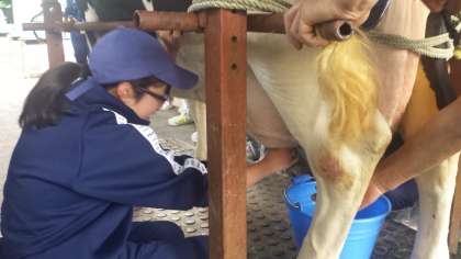 小林農場では、グループに分かれて搾乳体験をしました。牛の体温の高さを感じていました。