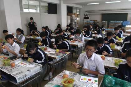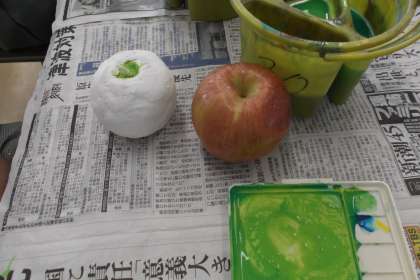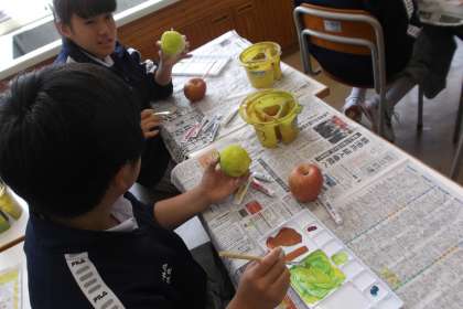2年生の美術は 紙粘土で「りんご」を作り 水彩絵の具で着色していました。