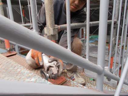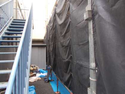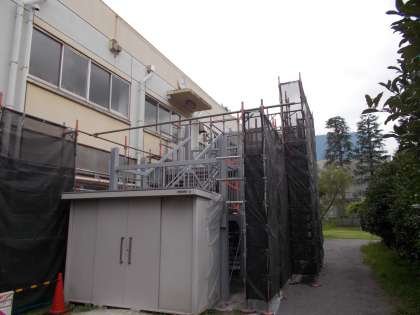 校舎の北側の外壁塗装が進んでいます。 理科室前の非常階段の塗装も行われています。
