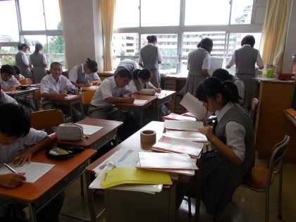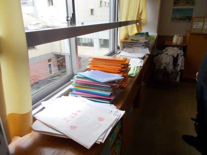 各学年で夏休みの宿題を回収して、仕分けをしています。