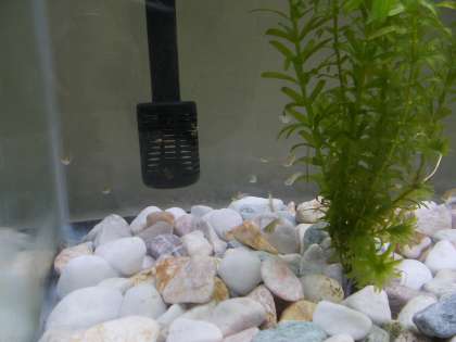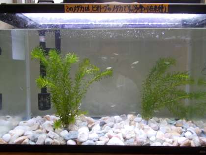 夏休み中はビオトープに返していた メダカの一部を職員室前の水槽に 戻しました。 元気に泳いでいます。