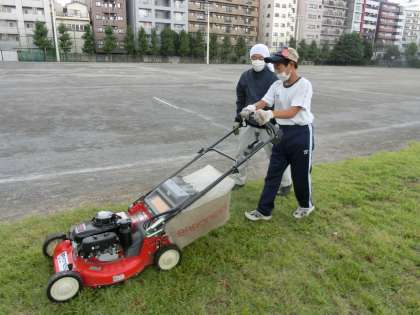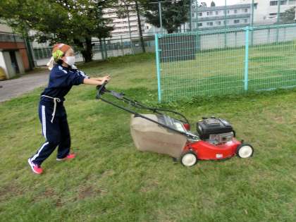 主事さんの仕事の体験です。 芝刈り機を使いました。