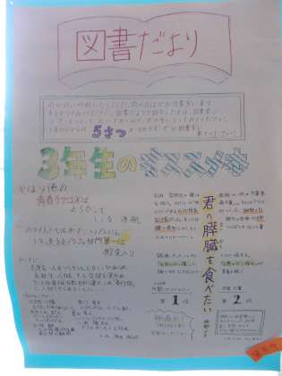図書室 公開日 2017/10/10 更新日 2017/10/10 学校日記 テニスコート側に図書委員が作ったPOPが 置いてあります。 図書だよりのカラー版が掲示されました。 新聞記事コーナーは桐生選手特集です。 いいね(0)