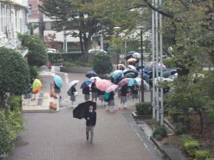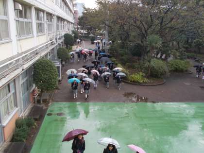 7:45からの朝練習のために 雨にもかかわらず、続々と 傘の列が続いています。