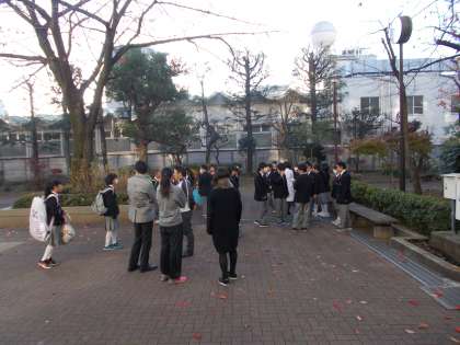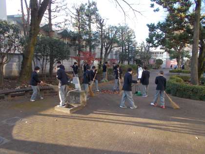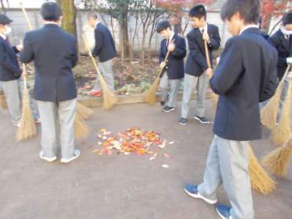 1年の落ち葉掃きです。 中庭の花壇の落ち葉も掃きだしています。