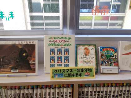 図書室の体育館寄りには、クリスマス、年末年始、 図書館大賞に関わる本が展示されていました。