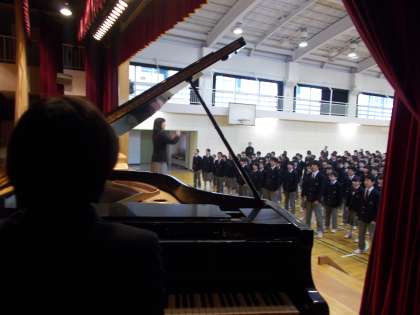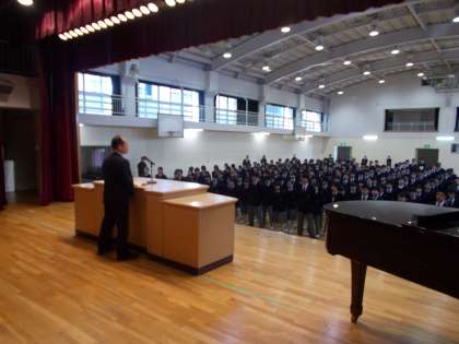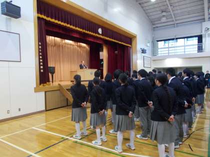 終業式は校長先生のお話し、校歌斉唱。 生徒は式開始5分前から、きちんと 整列していました。