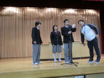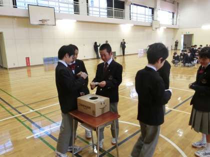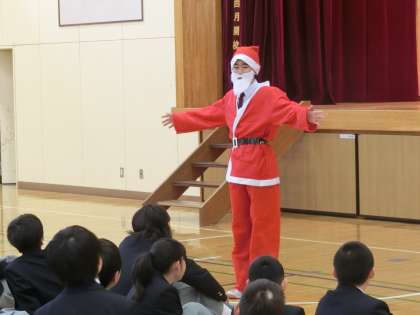 2学期最後の日、学級委員主催のレク大会で借り人競争を行いました。サンタも登場し、盛り上がりました。