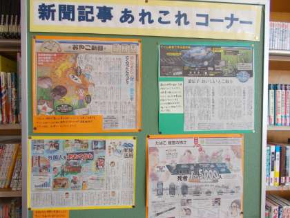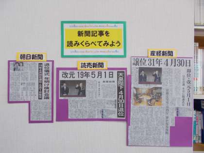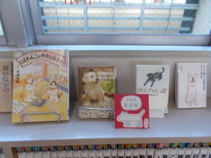 「読み比べ」コーナーでは、天皇の退位。 入口付近には戌年に関係する「犬」にかかわる本が 集められています。