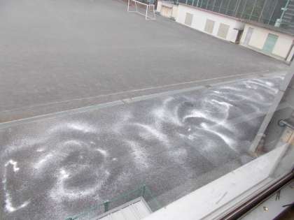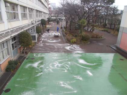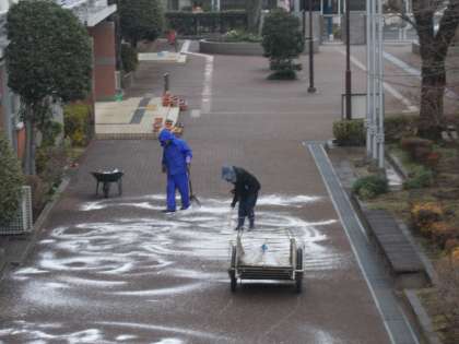 午後からの明日にかけての降雪に備えて 主事さんが中庭、給食搬入口に融雪剤を まいてくれています。