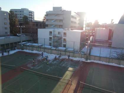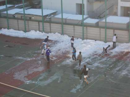 日陰になっていて、なかなか融けない雪を テニス部が一所懸命雪かきをしていました。