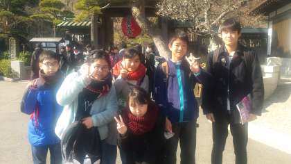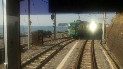長谷寺で生徒と出会いました。 水平線を見ながら江ノ電が走ります。