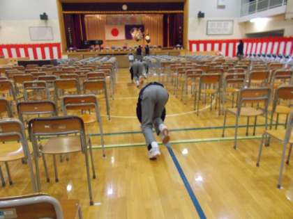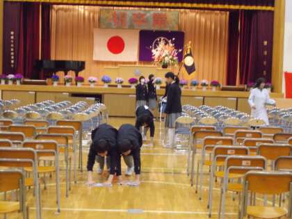 卒業生の花道は、1・2年生が雑巾がけをしてくれます。 様々な表示の準備も抜かりなく、行います。