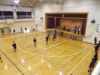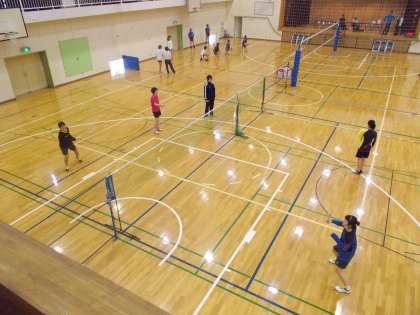 体育館ではバドミントン部、 ステージ側ではバレー部が 練習試合を行っていました。