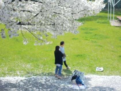 保護者の方はビオトープ側の桜の木の下で