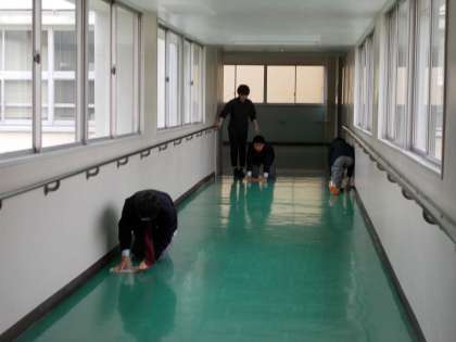 新入生の通路となる2階渡り廊下の雑巾がけ