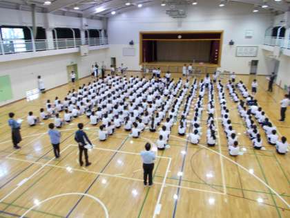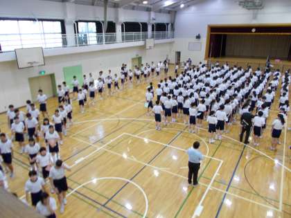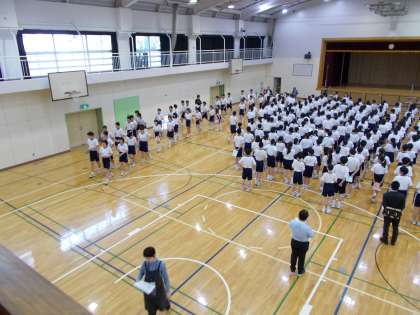 今日は、土曜授業日です。まずは、学校全体での身体計測です。体育館でみんなで説明を聞き、いよいよクラスごとに、計測場所に移動しました。