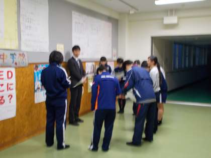 バレーボール部が、今週末の大会について顧問から説明を聞いているミーティングの様子です。