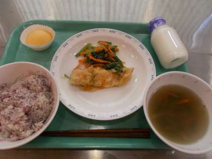 お祝いの和食にイチゴシロップを少し入れた蒸しパンでした。