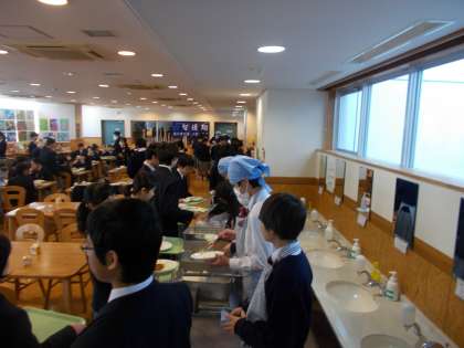1年生はランチルームで楽しそうに食べていました。