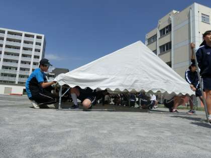 テント設営も多くの作業工程があります。 倉庫からテントを運ぶ→骨組みを作る →外と内でテントの布を張る