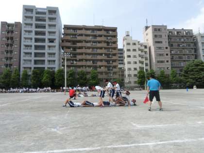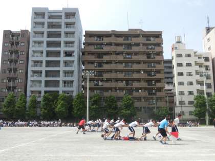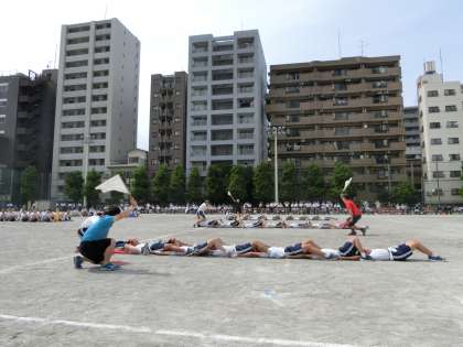学年種目 2年 蛇の皮むき です。 選手がキャタピラーのようになって速さを競う競技です。キャタピラーとは、芋虫という意味ですが、ここでは、蛇の皮むきという題名になっています。三宿中では、初めて採用された学年種目です。