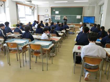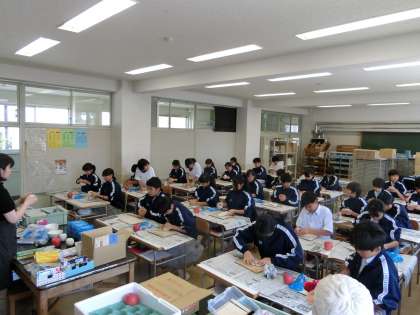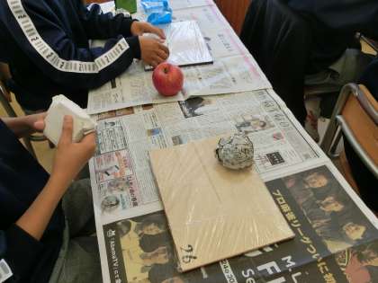今日は、実技教科の授業風景をお届けします。まずは、美術の授業です。紙粘土でリンゴを作ってみるという内容です。紙粘土のほぐし方や、形づくりでいかに本物のリンゴに近づけるかが、難しそうです。