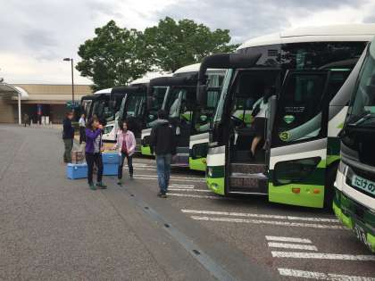 談合坂のサービスエリアにつきました、グレープジュースを配りました。16時ごろ帰校予定です、緊急連絡メールでも、配信しました。