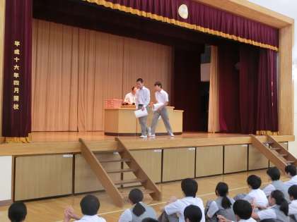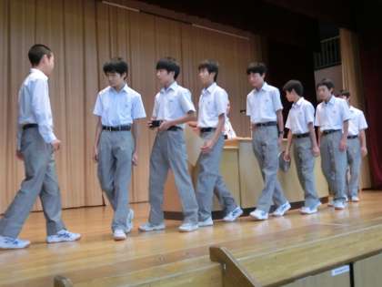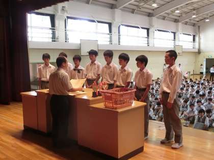 朝会後、部活動の表彰がありました。まずは、ソフトテニス部の男子です。