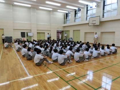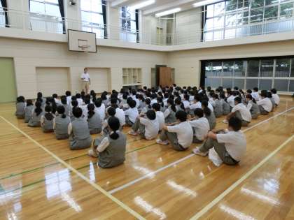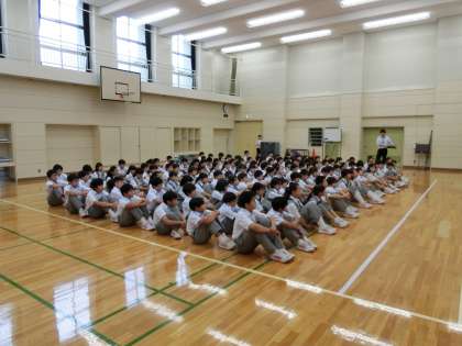 1年生は、格技室で学年朝会を開きました。日常の生活面での注意がありました。集会での聞く態度は移動教室以降、良くなっています。あとは、生活の場で実践できることが大切です。