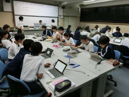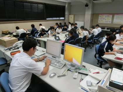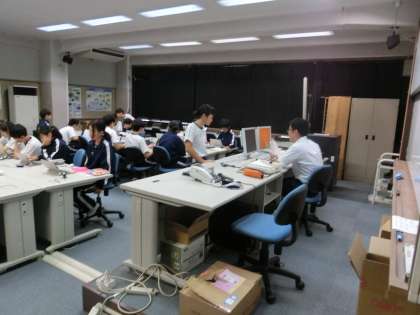 パソコン室で、夏休みに向けて、eラーニングの活用方法の確認の授業です。
