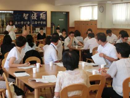 午後は、学び舎の小学校、池尻小、中里小、三宿小の先生がたと一緒に学習習得確認会議を実施しました。どのグループも白熱した話し合いが行われていました。最後は、小学校の校長先生が話を統合する話をしてくださいました。