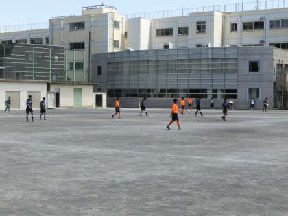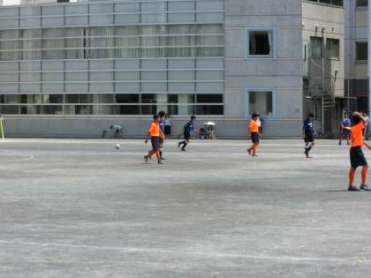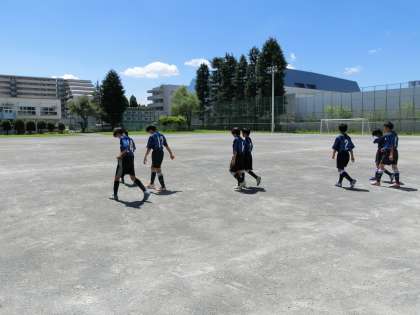 サッカー部、夏季研修大会、青色のユニフォームが三宿中、紫は富士中、オレンジは駒沢中です。
