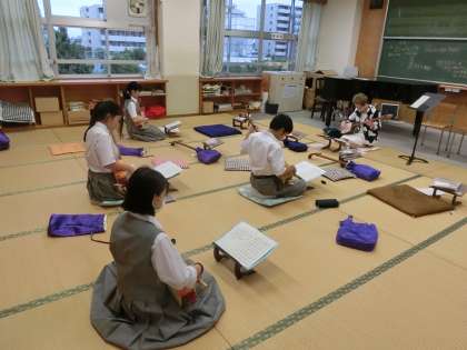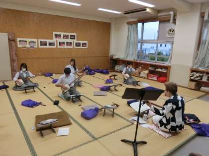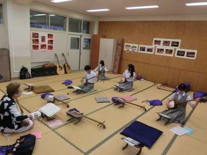 三味線教室です、今日は三年生が修学旅行の事前学習に参加しているので、1・2年生が参加してくれています。今日は、黒田節を練習しました。2年生の先導で、なんとか形になりつつあります。