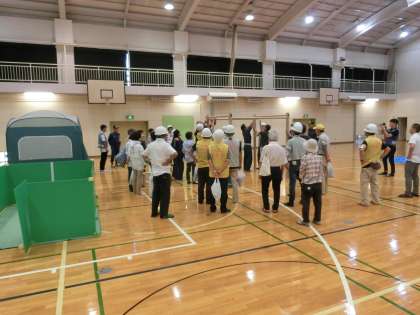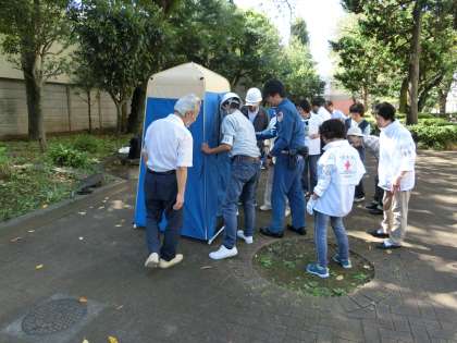 太子堂まちづくりセンター主催の避難所運営訓練が実施されました。地域の方が皆さん真剣に避難所の受付、体育館の中の避難テント等の設営、簡易トイレの設営などの方法を学んでいました。