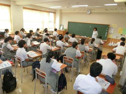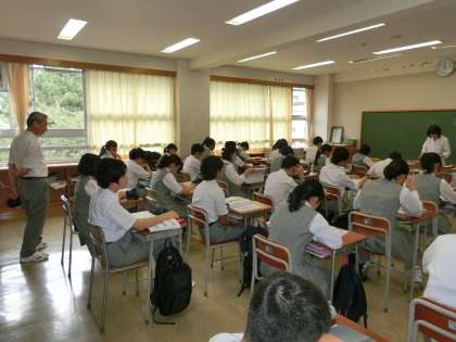 B組です。理科の授業です。2人の先生で授業を行っています。