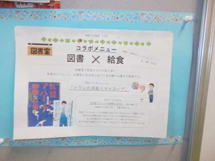 9月17日(火)図書室とコラボ 公開日 2019/10/07 更新日 2019/10/07 給食 ★献立★ ガーリックライス ベーコンと野菜のイタリア風炒め イワシの洋風トマトスープ シトラスティーゼリー 牛乳 図書室の先生とコラボで決めた献立です。 妖怪アパートの幽雅な食卓の中から イワシの洋風トマトスープです。 この本のファンの生徒、喜んでくれたでしょうか。 いいね(0)