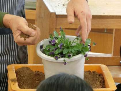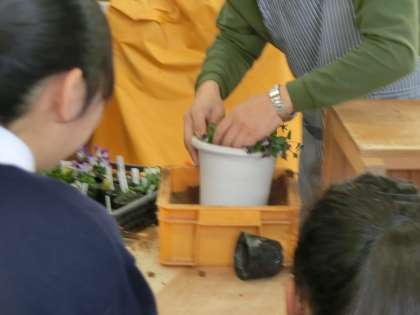 技術の授業で栽培についてを学びました。花が育ってきたので、大きな鉢に植え替える学習です。