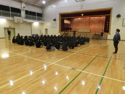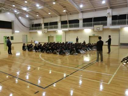 3年生は、体育館で2時間目に学年集会を行いました。年末年始は家族と過ごす機会が多い時期です。アナと雪の女王の話を枕に、家族や仲間の大切さについての話がありました。